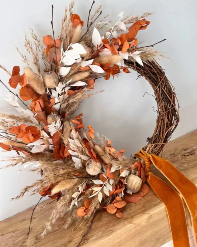Perfectas para puertas o paredes, estas coronas decorativas se venden muy bien durante toda la temporada y puedes hacerlas con materiales naturales o sintéticos.