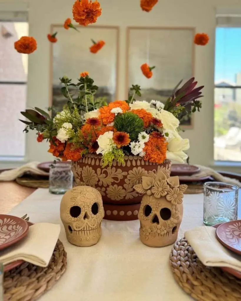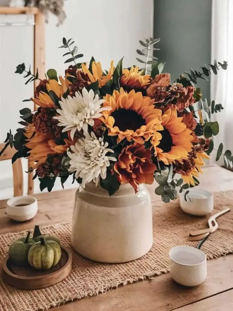 Usa piñas secas, ramas, hojas otoñales y pequeñas calabazas para crear centros de mesa cálidos y acogedores, perfectos para cenas familiares o eventos de temporada.