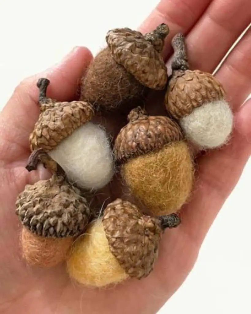 Una idea encantadora y fácil de hacer: crea pequeñas bellotas usando bolas de lana afieltrada y tapas reales de bellota. Solo necesitas pegar las bolitas en las cúpulas con silicona caliente.