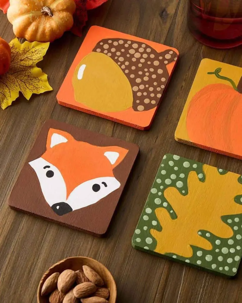 Pinta o graba diseños otoñales en portavasos de corcho. Son prácticos, económicos de producir y perfectos para regalar o vender en sets.