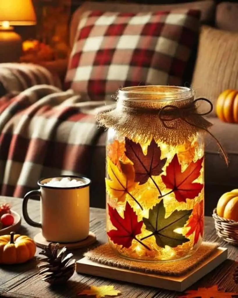 Pinta un frasco con pintura acrílica naranja, añade hojas artificiales con Mod Podge y coloca una vela de té dentro para un brillo cálido y acogedor.