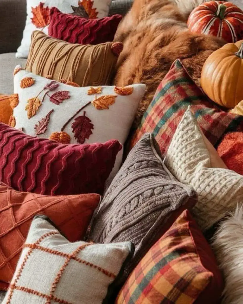 Usa una funda de almohada lisa y transfiere un diseño otoñal en vinilo térmico con Cricut. Presiona con plancha o prensa de calor para decorar tu hogar o vender.